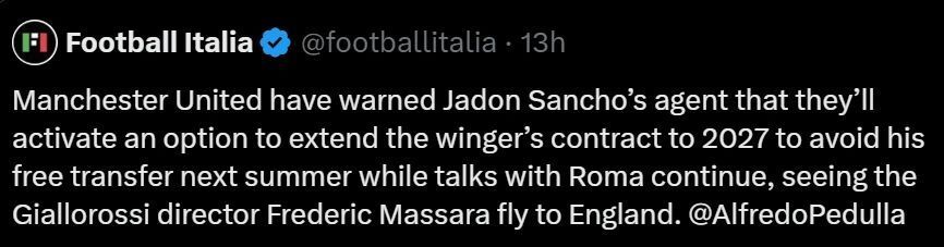 意大利名记阿尔弗雷多·佩杜利亚在「意大利足球」上称,曼联告知桑乔的经纪人,计划激活他的一年优先续约条款,这将把桑乔的合同期延长到2027年,避免他明年1月可以接洽甚至草签海外俱乐部、明夏免费走人的结局。